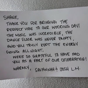 "Attended a wedding and Shane was the DJ. He did such a great job at keeping the music perfect for the crowd. He kept the party involved and never missed a beat. The audience was entertained for the entire wedding "